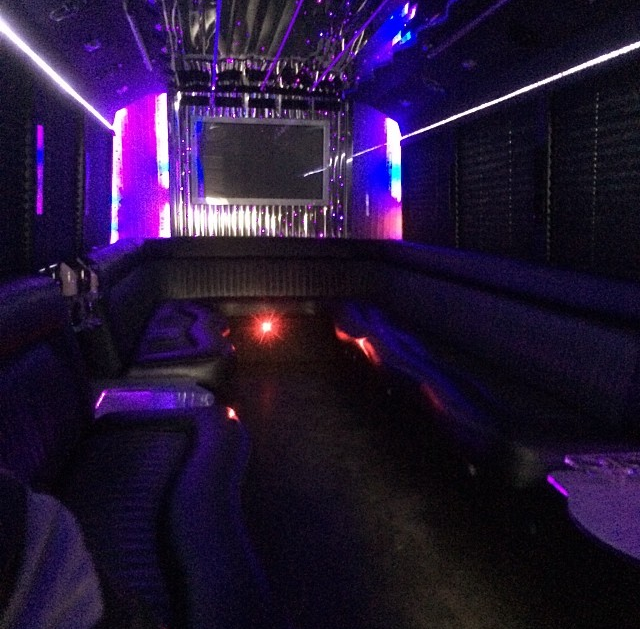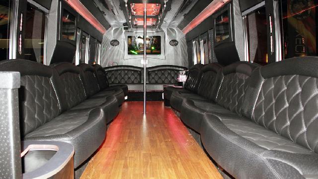 Well the name says it all, a bus with the limo interior. The interior of the party bus arranged by Global Limos is luxuriously furnished to provide for a pampering and unforgettable experience. The 28, 30, 32, 34 passenger party bus features a Mercedes inspired interior design, complete with custom limousine style leather seating. The vehicle is also furnished with Italian tile floors, 3 dimensional LED-lit ceilings, and privacy curtains, extra wide aisles for ease of movement, strobe and laser lightings. Built in restrooms are subject to availability. The party bus also contains two bars, ideal for casual or corporate interactions.