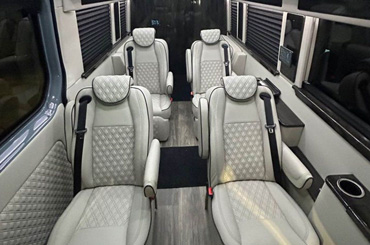 Sprinter Executive shuttle conversion: Sprinter shuttles have quickly become the go-to vehicle in the industry. With a seating capacity of up to 14 people in the rear, the option of a table for a private meeting, 2 TVs, and dividers, this is the most versatile setting any limo operator or bus transporation company can order.